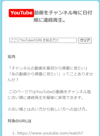 YouTube動画をチャンネル毎に日付順に連続再生。
